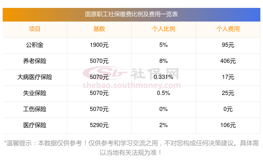 2025年固原社保缴费多少钱?下表是2024-2025年固原社保费用明细参考,新社通app-社保缴费查询工具提供的最新数据如下:
