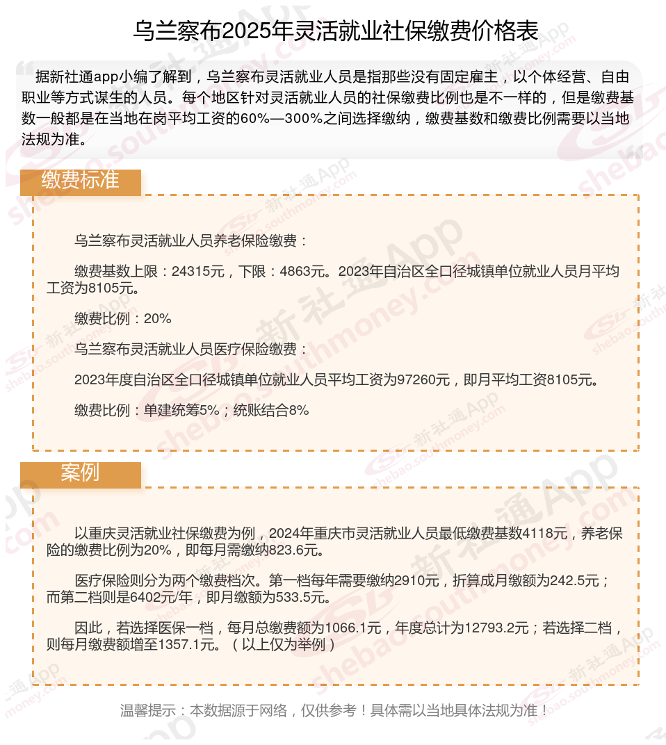 据新社通app数据显示,乌兰察布灵活就业人员养老缴费基数2024-2025年最新标准如下: