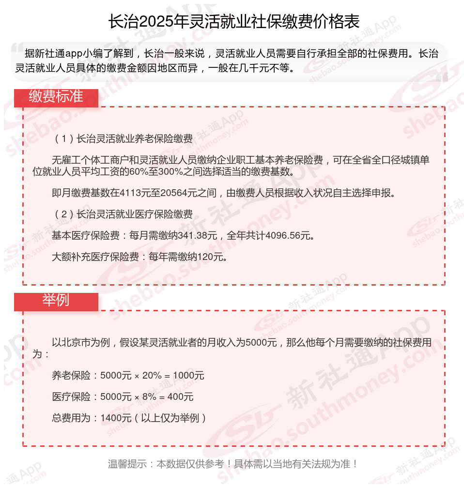 那么,长治灵活就业人员社保缴费基数最新标准,长治灵活就业社保多少钱一个月?根据新社通app-社保缴费查询工具提供的2025社保缴费标准详情数据: