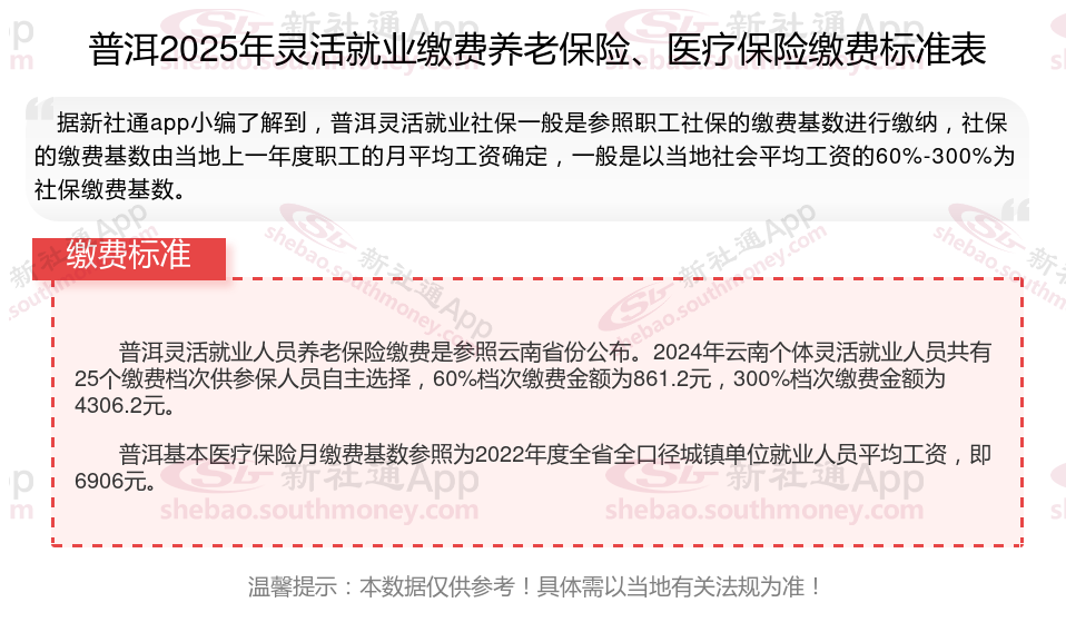 据新社通app数据显示,普洱灵活就业养老保险的缴费基数为:4306.2元。灵活就业人员参保缴费的比例为个人20%。