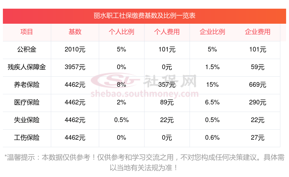 丽水缴费社保比例一览 社保公司和个人各交多少?下表是2024-2025年丽水社保费用明细参考,新社通app-社保缴费查询工具提供的最新数据如下: