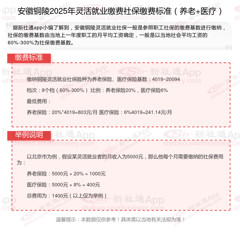 那么,个人社保是多少钱一个月 安徽铜陵灵活社保交多少钱?根据新社通app-社保缴费查询工具提供的2025社保缴费标准详情数据: