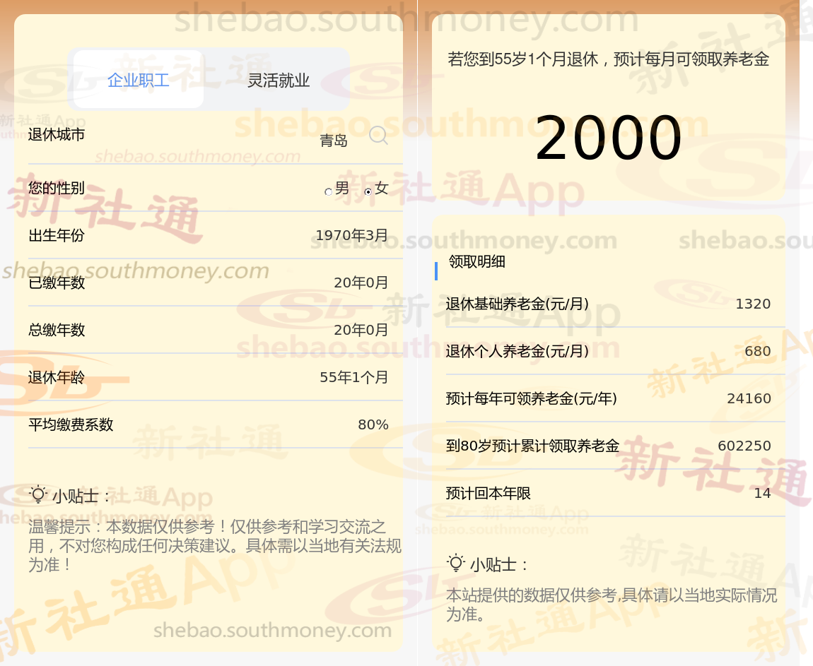 夏某,青岛人,1970年出生,是一名拥有20载社保缴费年限的退休女性,缴费档次稳定在80%。岁月流转,她终于迎来了自己的退休时光。借助新社通app养老金在线计算器计算所得: