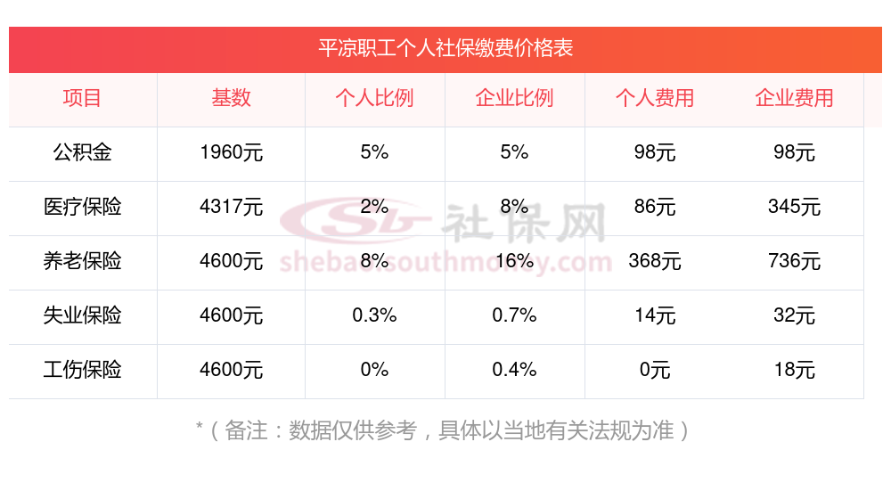社保(社会保险)是公民基本生活和社会福利而建立的一种强制性社保制,旨在通过社会共济的方式,分担个人在养老、医疗、失业、工伤、生育等方面的风险。接下来随社保君了解一下2025年平凉社保交多少钱,2025年平凉社保缴费标准的详细内容。