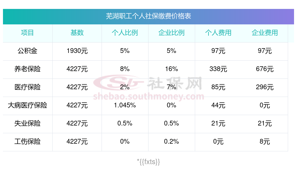 芜湖缴费社保比例一览 社保公司和个人各交多少?下表是2024-2025年芜湖社保费用明细参考,新社通app-社保缴费查询工具提供的最新数据如下: