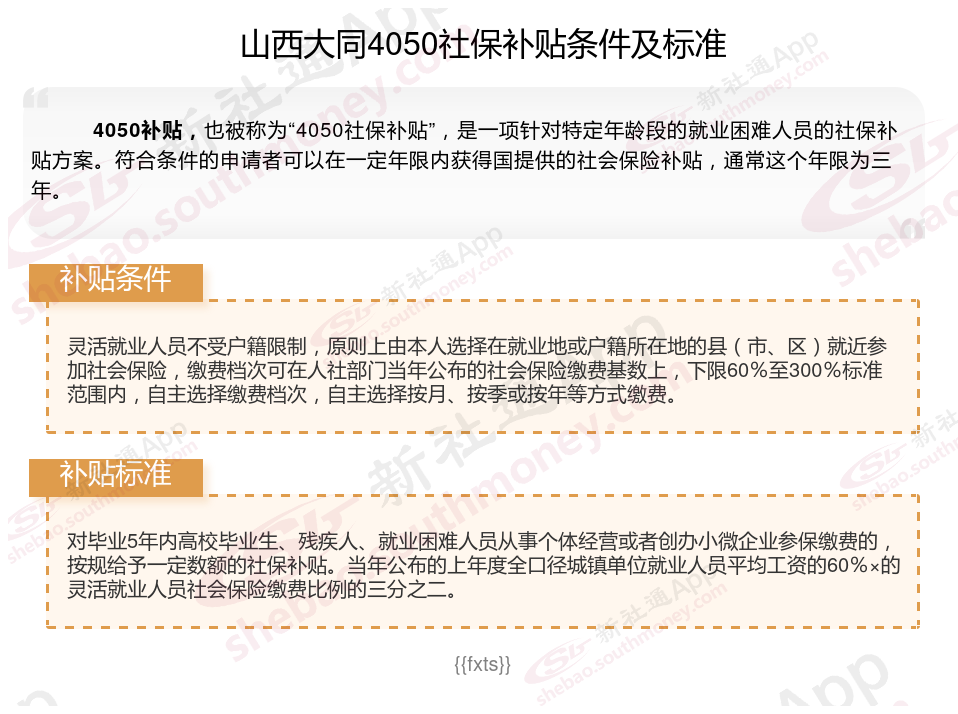 4050社保补贴标准据新社通app小编了解,通常,4050社保补贴包含基本医疗保险和基本养老保险两个险种,社保补贴金额为申请人实际缴纳基本养老保险和基本医疗保险金额的2/3,具体标准以当地社保局公布的数据为准!那么山西大同4050灵活就业困难人员社保补贴标准是多少?山西大同4050社保补贴需要符合什么条件?接下来随新社通APP小编具体了解一下4050社保补贴内容。