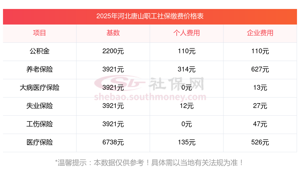 河北唐山个人最低五险一金自己交多少?2025年社保缴费价目表,下面和社保丫丫一起来了解下2024-2025年河北唐山最低配社保费用明细参考,新社通app-社保缴费查询工具提供的最新数据如下: