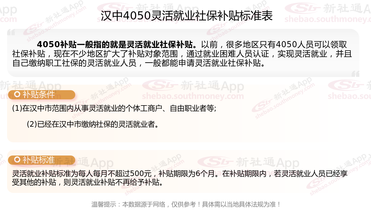 二、2025年汉中4050社保补贴标准及条件,最新如下: