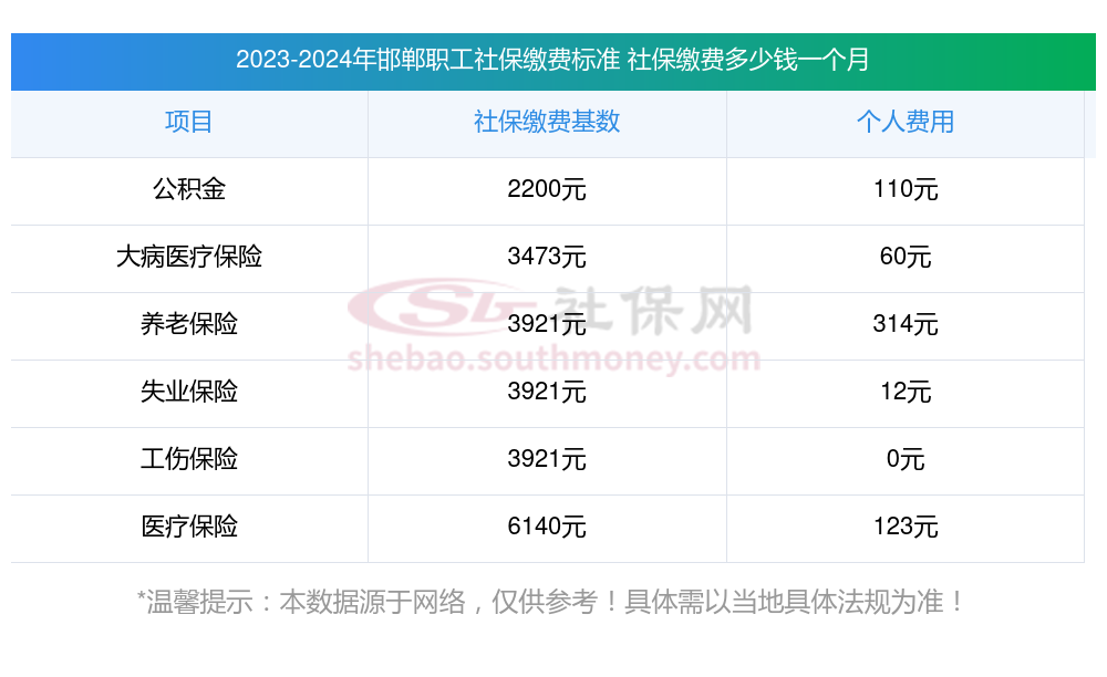 邯郸缴费社保比例一览 社保公司和个人各交多少?下表是2024-2025年邯郸社保费用明细参考,新社通app-社保缴费查询工具提供的最新数据如下: