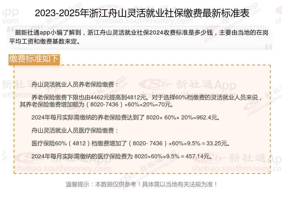 浙江舟山灵活就业社保缴费标准,浙江舟山社保缴费多少钱?下表是2024-2025年浙江舟山社保费用明细参考,根据新社通app-社保缴费查询工具提供的最新数据如下:
