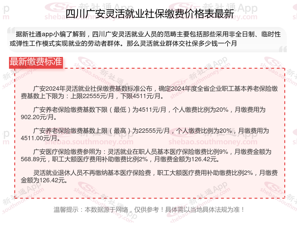 据新社通app数据显示,四川广安企业灵活就业养老保险的缴费基数为:4511元。