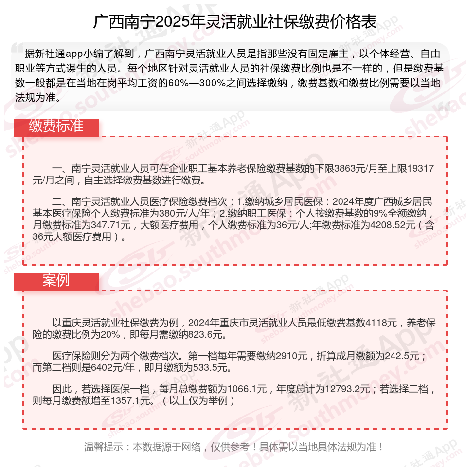 广西南宁自由职业社保缴纳金额是怎么计算?根据新社通app-社保缴费查询工具提供的最新数据如下: