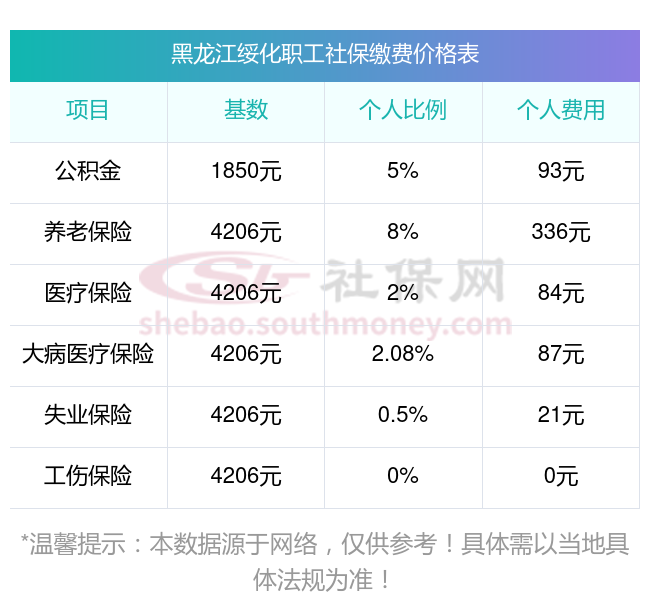 据新社通app显示,黑龙江绥化社保缴费基数2025标准,(社保最低一个月要交多少钱)黑龙江绥化社保费用如下: