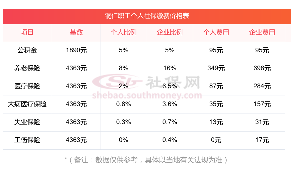 据新社通app小编了解到,2025年铜仁社保缴费基数参照为3579.00,铜仁社保缴费明细如下: