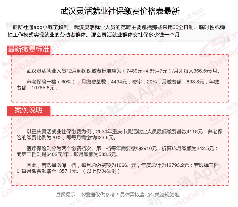 据新社通app数据显示,2024-2025年武汉灵活就业人员养老保险的缴费标准:
