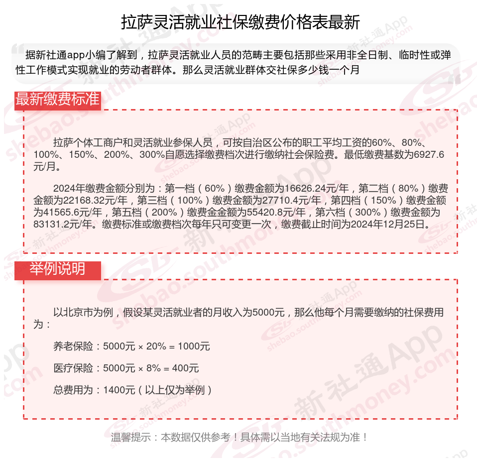 2024-2025年拉萨灵活就业人员社保缴费标准是多少?社保交完退休能领多少钱?下表是2024-2025年拉萨社保费用明细参考,根据新社通app-社保缴费查询工具提供的最新数据如下: