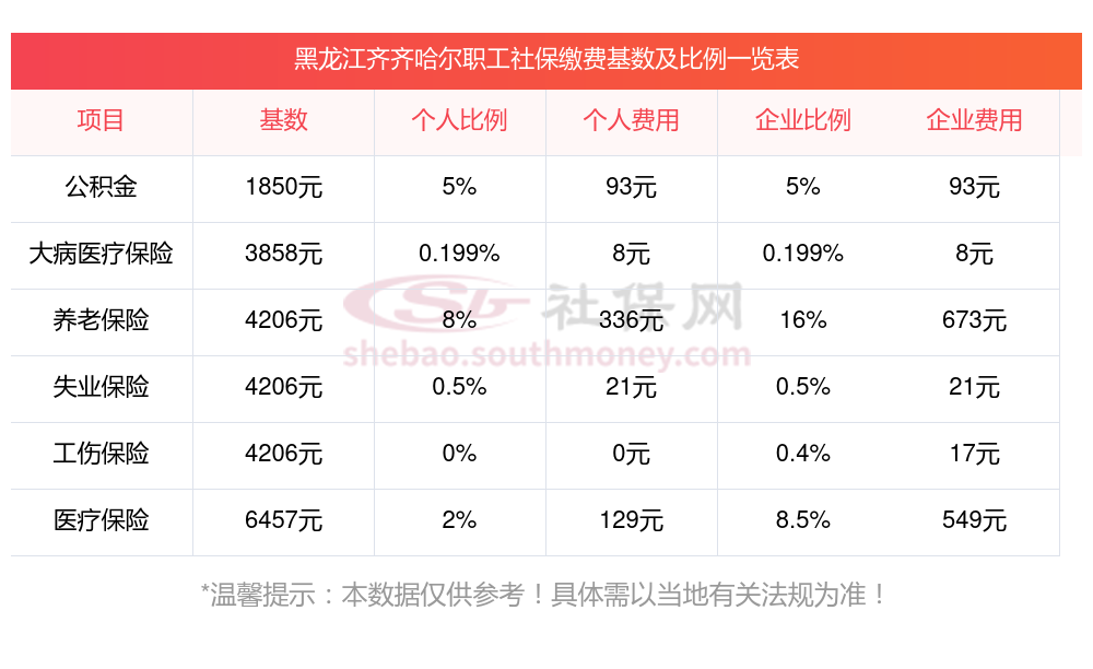 2025年黑龙江齐齐哈尔社保缴费多少钱?下表是2023-2024年黑龙江齐齐哈尔社保费用明细参考,新社通app-社保缴费查询工具提供的最新数据如下: