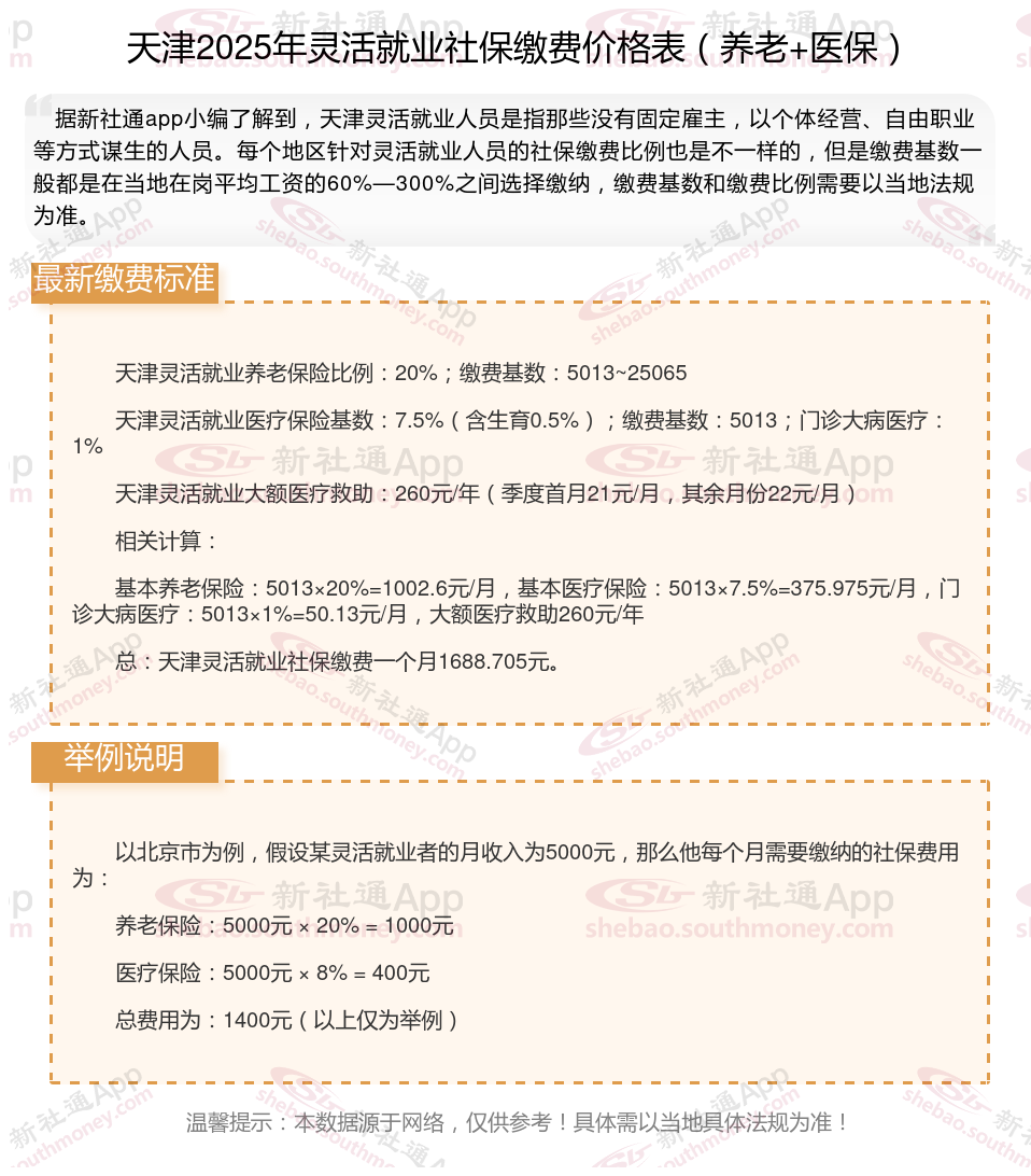 天津灵活就业社保缴费价格表 2024-2025年天津灵活就业养老、医保缴费标准一览表,下表是2024-2025年天津社保费用明细参考,根据新社通app-社保缴费查询工具提供的最新数据如下: