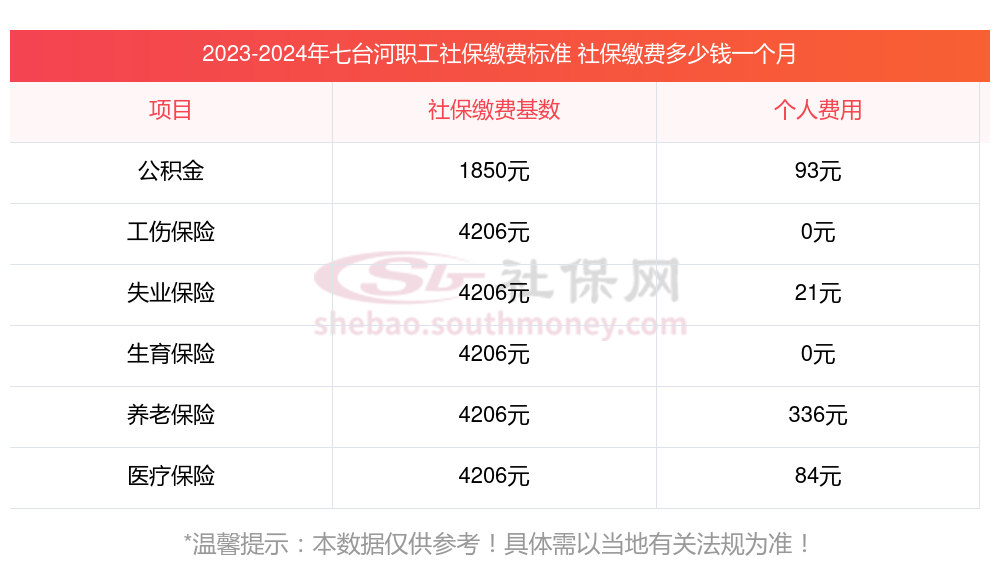 据新社通app显示,七台河社保缴费基数2025年标准,(社保最低一个月要交多少钱)七台河社保费用如下: