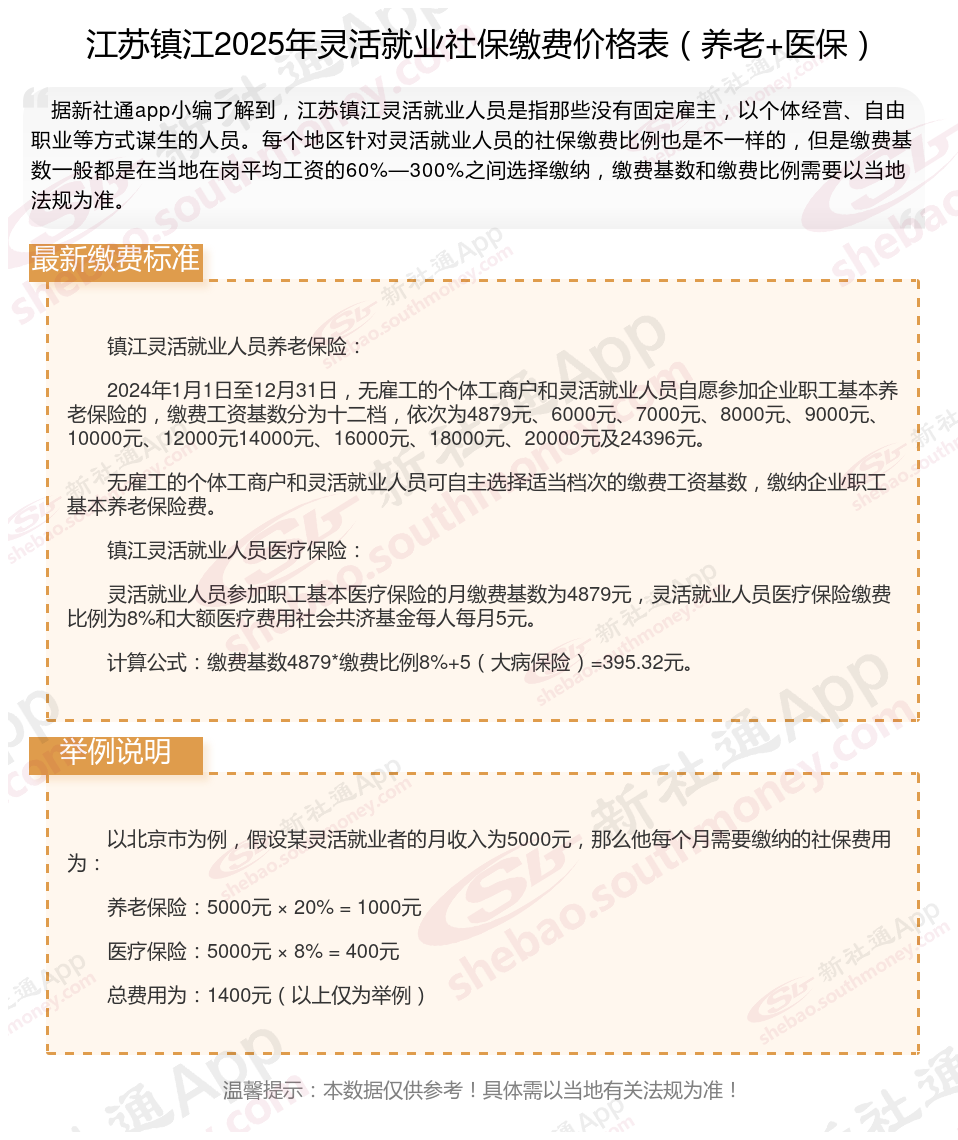 据新社通app数据显示,江苏镇江灵活就业养老保险缴费基数2024-2025年最新标准如下: