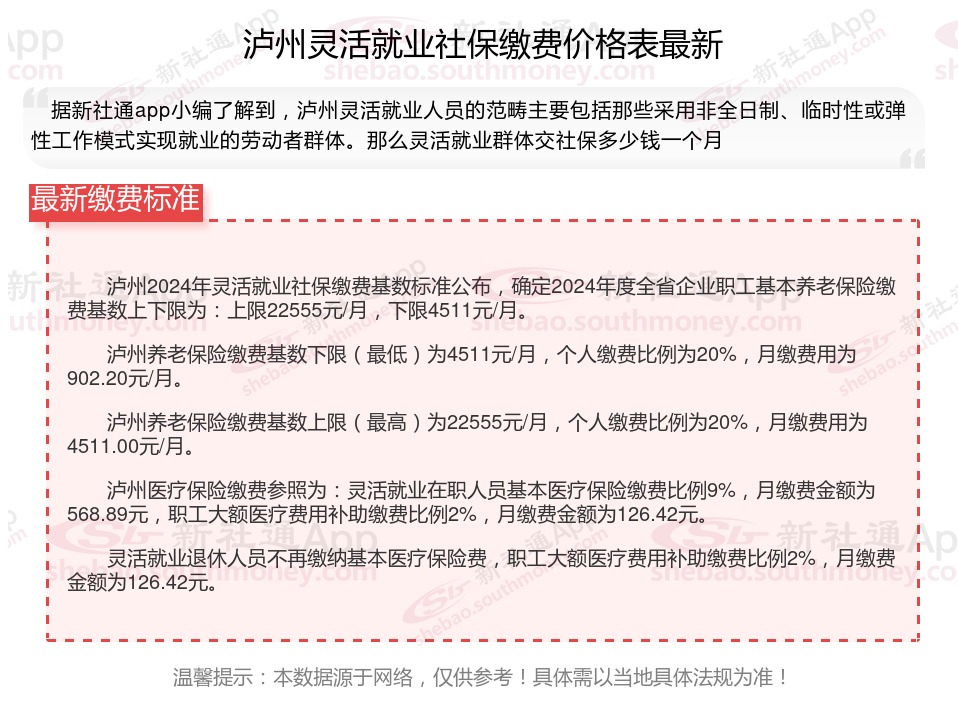 泸州灵活就业自己交社保一个月要交多少钱?泸州灵活就业人员社会保险缴费标准,根据新社通app-社保缴费查询工具提供的最新数据如下: