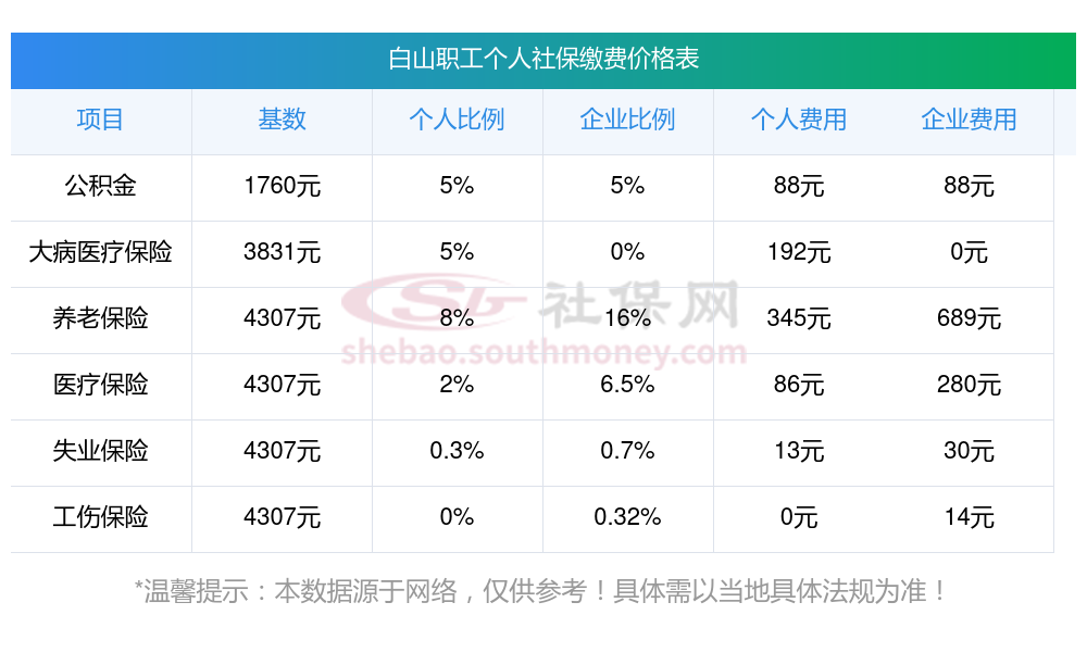 白山职工社保缴费多少钱?2025年白山职工社保缴费基数最新参考为:3579.00,具体如下: