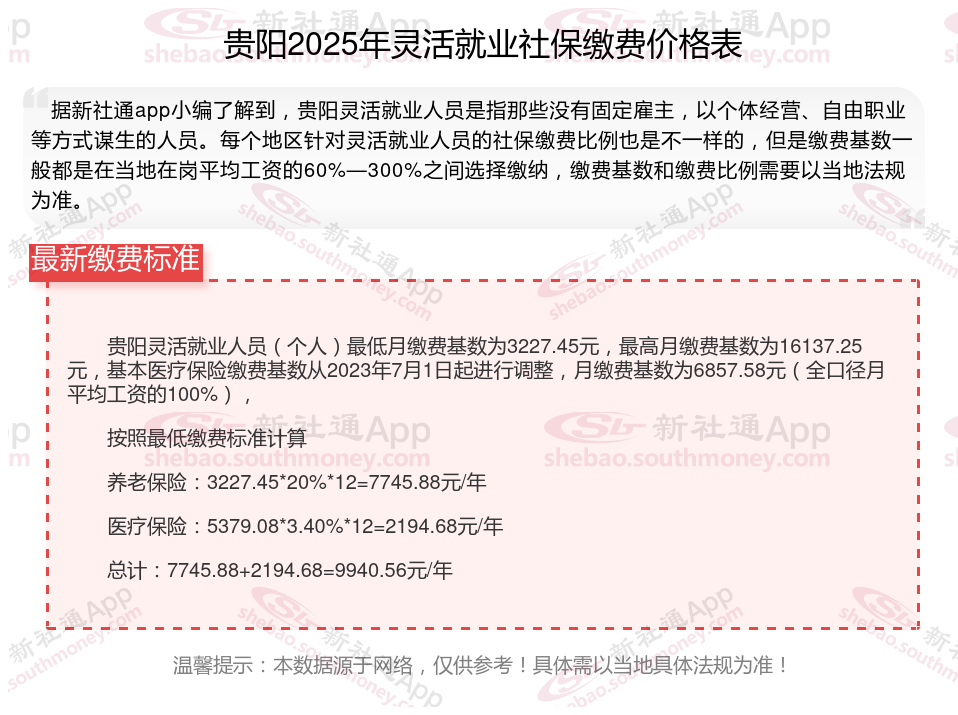 据新社通app数据显示,2024-2025年贵阳灵活就业人员养老保险的缴费标准是根据缴费基数来确定的: