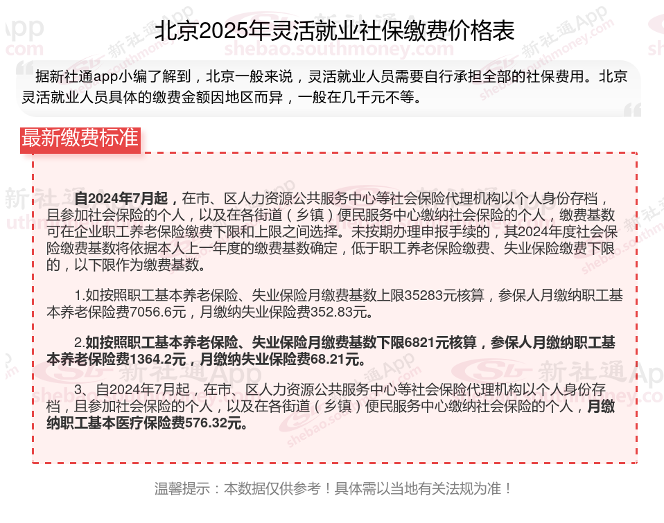 灵活就业人员自己交保险一个月多少钱?北京打工人社保缴纳金额是怎么计算?根据新社通app-社保缴费查询工具提供的最新数据如下: