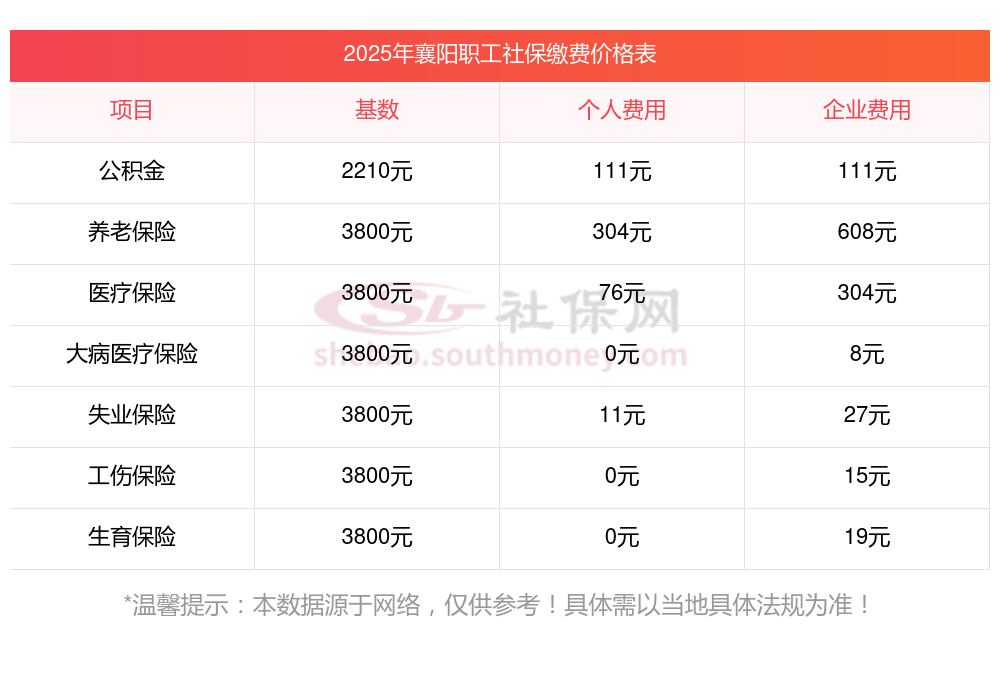 2025年襄阳社保缴费多少钱?下表是2024-2025年襄阳社保费用明细参考,新社通app-社保缴费查询工具提供的最新数据如下: