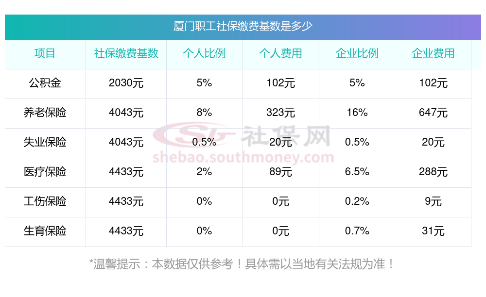 缴费基数、缴费比例以及当地公布的具体法规等,都是确定社保缴费金额的重要因素。接下来看看,厦门职工社保2024-2025年缴费标准 厦门个人缴纳社保每月要多少钱??如下: