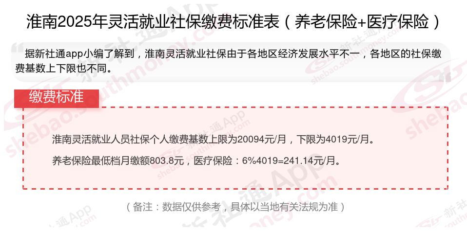 缴费标准最新公布!淮南2024-2025年度灵活就业社保缴费基数明细来了,根据新社通app-社保缴费查询工具提供的2025社保缴费标准详情数据: