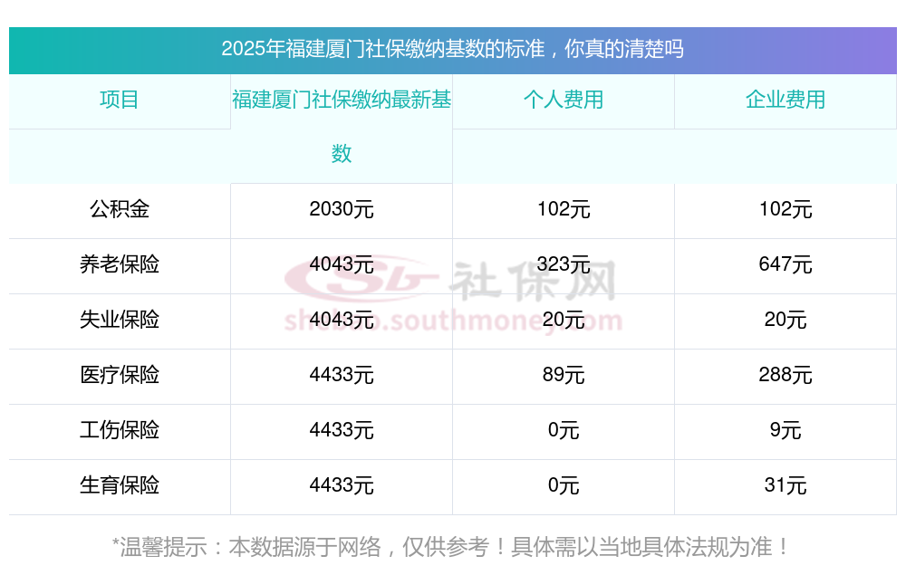 福建厦门社保最低基数2025是多少,下表是2024-2025年福建厦门社保费用明细参考,新社通app-社保缴费查询工具提供的最新数据如下:
