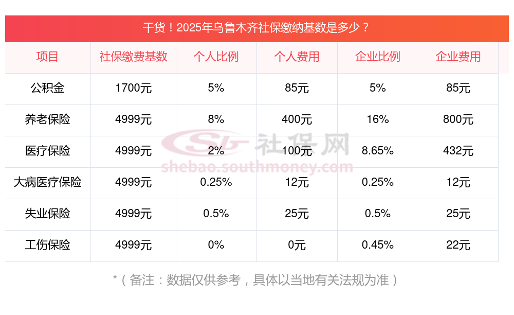 缴纳社保能抵御疾病、失业、养老等重大风险,避免陷入经济困境。也能享受医保报销、养老金增长等红利。社保是劳动者的法定权利,断缴可能影响购房、落户、子女教育等。据新社通小编了解,乌鲁木齐社保养老保险基数为:4999.00。那么一个月需要缴纳多少钱?跟着新社通小编一起来了解一下2025年乌鲁木齐社保缴费详情。