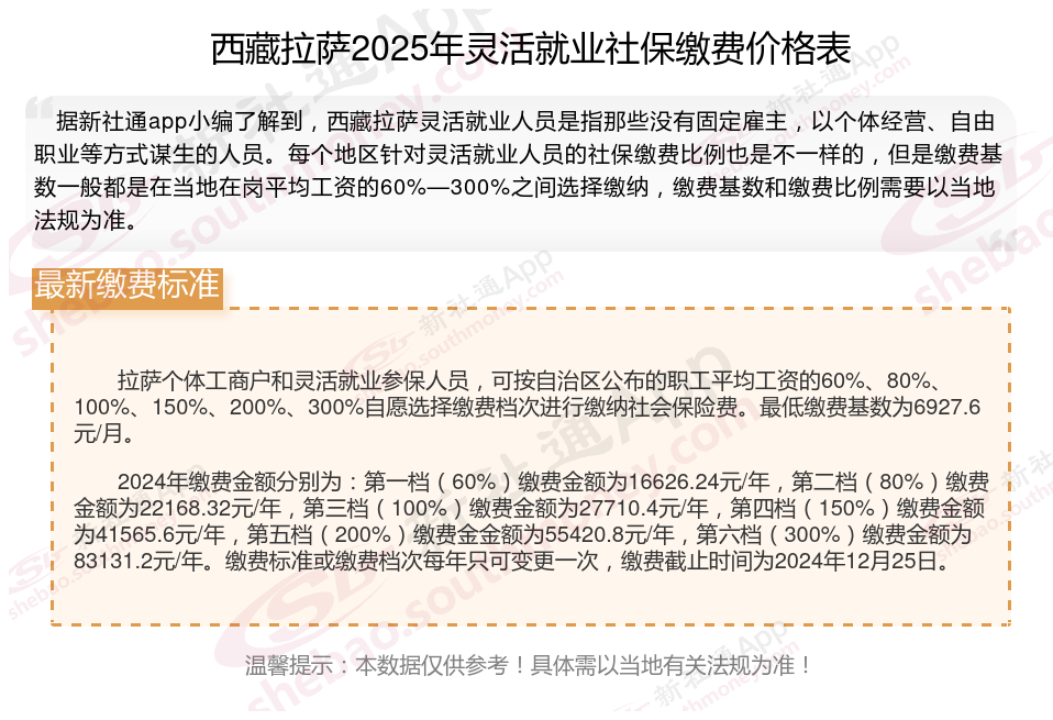 据新社通app数据显示,2024-2025年西藏拉萨灵活就业人员养老保险的缴费标准是根据缴费基数来确定的: