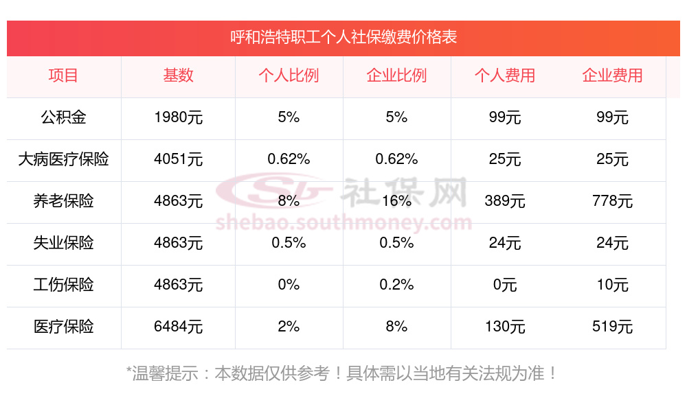 员工五险一个月交多少钱 公司加个人是多少?下表是2024-2025年呼和浩特社保费用明细参考,新社通app-社保缴费查询工具提供的最新数据如下: