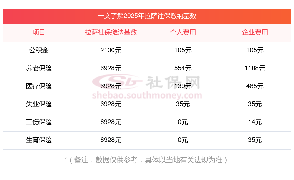 五险一金扣多少?你知道吗?下表是2024-2025年拉萨社保费用明细参考,新社通app-社保缴费查询工具提供的最新数据如下: