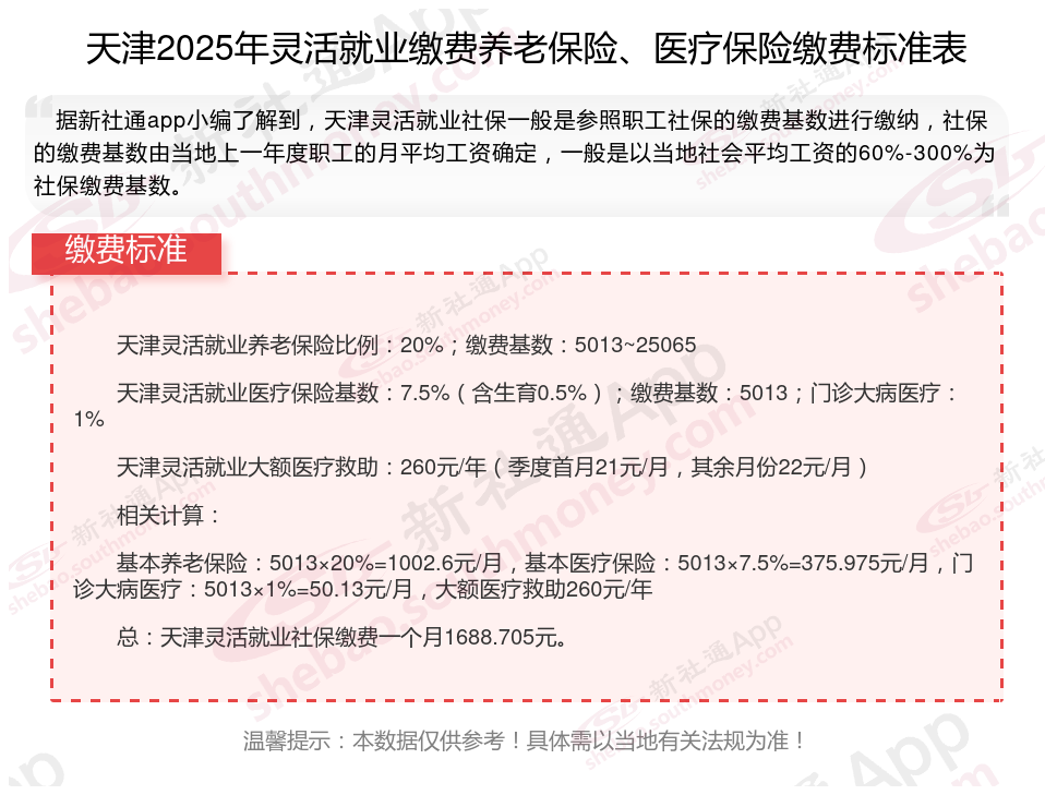 据新社通app数据显示,2024-2025年天津灵活就业人员养老保险的缴费标准是根据缴费基数来确定的: