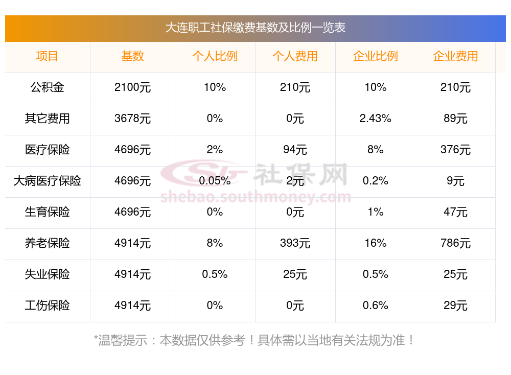 多个因素左右着社保的缴费金额,其中缴费基数、缴费比例,以及当地的具体法规是主要确定因素。那么,2024-2025年大连社保缴费标准是多少?2025年社保养老缴费多少钱?如下: