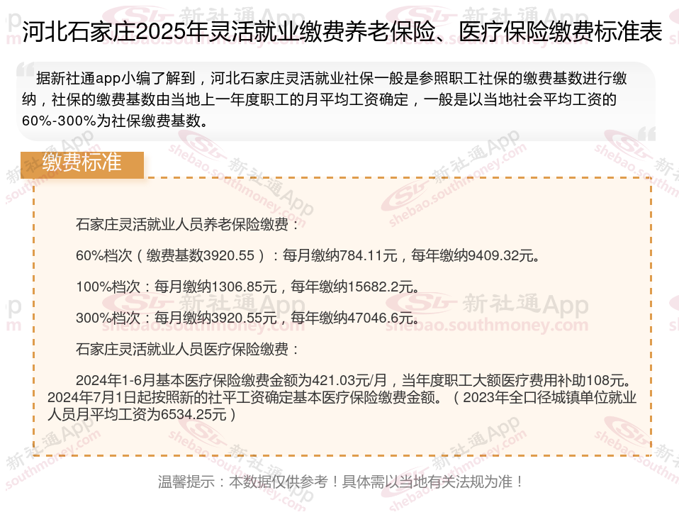 据新社通app数据显示,河北石家庄灵活就业养老保险的缴费基数为:3920.55元。灵活就业人员参保缴费的比例为个人20%。