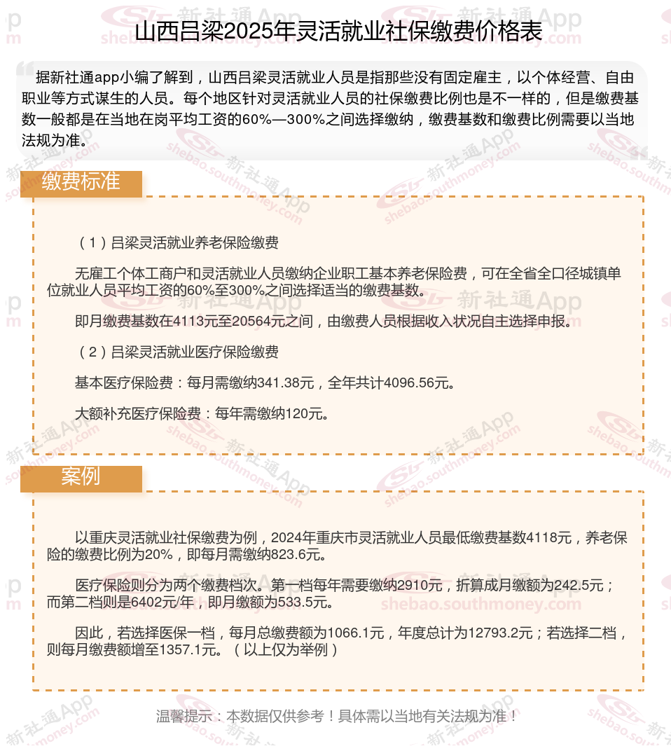 在山西吕梁,那些选择独立参保的灵活就业者,包括个体户和自由职业者,现在有机会加入企业职工基本养老保险体系。根据法规,这些参保者可以根据自身情况,在全省城镇单位就业人员平均工资的60%至300%范围内,挑选最适合自己的缴费基数。那么,关于山西吕梁2025年灵活就业人员的社保缴费标准是多少?以及每月需要缴纳的社保费用是多少,本文将为您提供最新的信息。