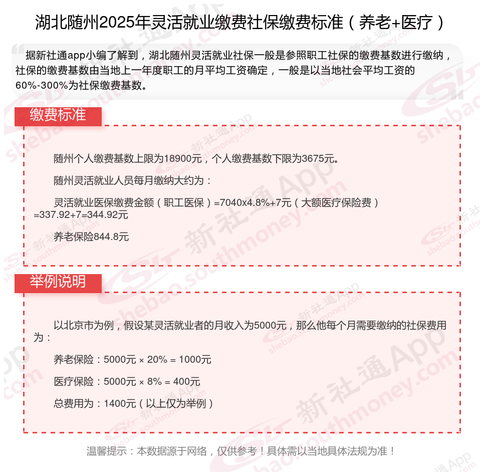 据新社通app数据显示,2024-2025年湖北随州灵活就业人员养老保险的缴费标准: