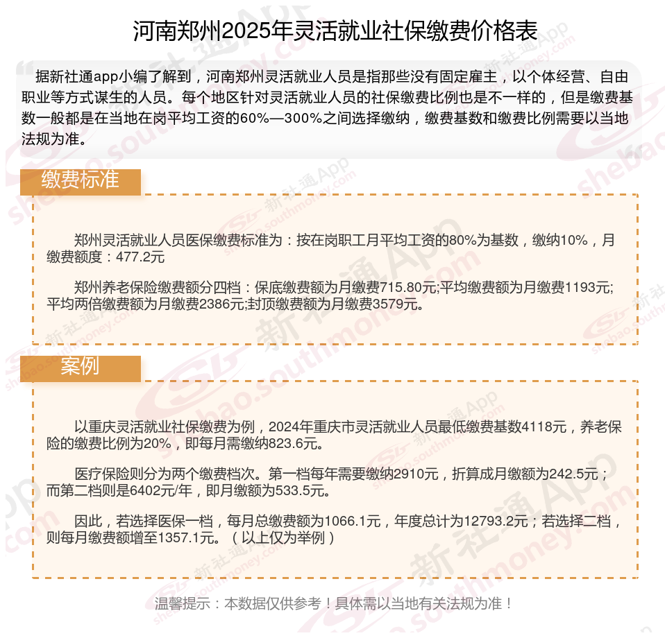 河南郑州灵活就业社保缴费标准,河南郑州社保缴费多少钱?下表是2024-2025年河南郑州社保费用明细参考,根据新社通app-社保缴费查询工具提供的最新数据如下: