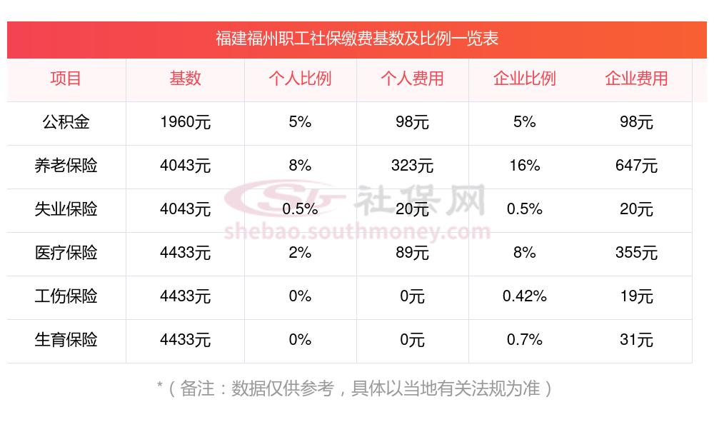 缴费基数、缴费比例以及当地的具体法规等因素,共同对社保的缴费金额起着确定性作用。那么福建社保要交多少钱一个月,如下: