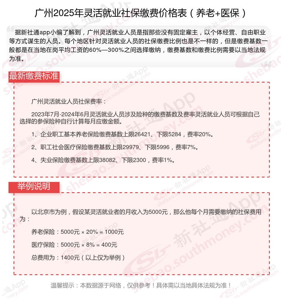 那么,灵活就业者社保是多少钱一个月 广州灵活社保交多少钱?根据新社通app-社保缴费查询工具提供的2025社保缴费标准详情数据: