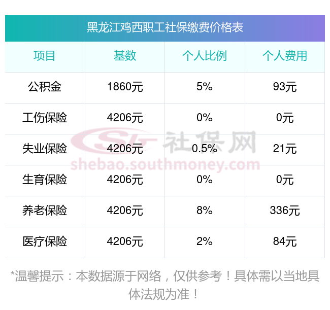 黑龙江鸡西五险一金交多少钱一个月?和新社通小编一起来看看2024-2025年黑龙江鸡西社保费用明细参考,新社通app-社保缴费查询工具提供的最新数据如下: