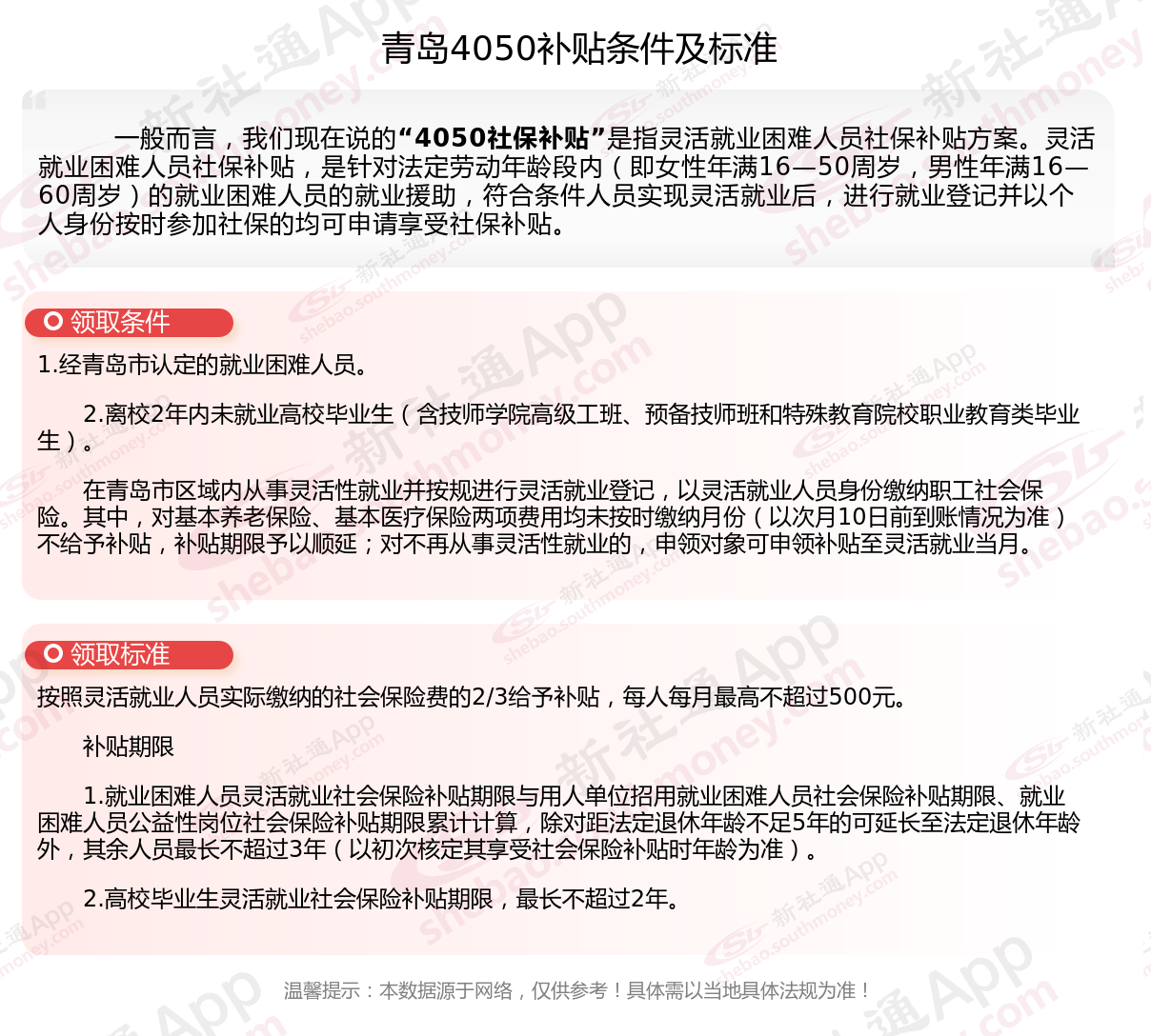 青岛补贴多少钱一个月?青岛灵活就业4050补贴标准: