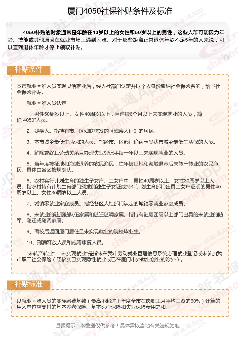 厦门“4050补贴”开始发放,申请4050的条件和要求材料?厦门灵活就业4050社保补贴多少钱?4050补贴所针对的人群,年龄限定为女性年满40周岁,男性年满50周岁。