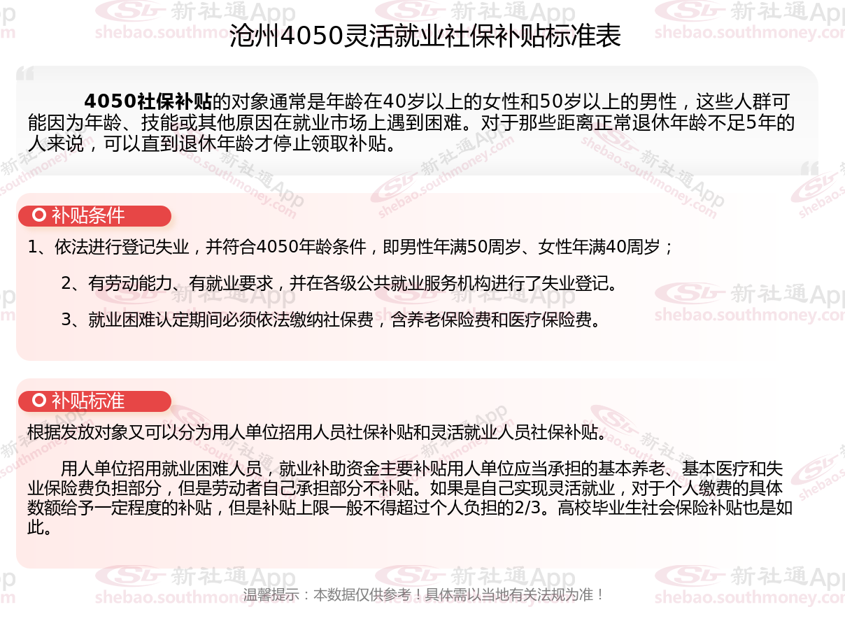 以上就是沧州4050灵活就业困难人员社保补贴的相关内容,欢迎关注新社通/下载新社通APP了解更多五险一金专业资讯。