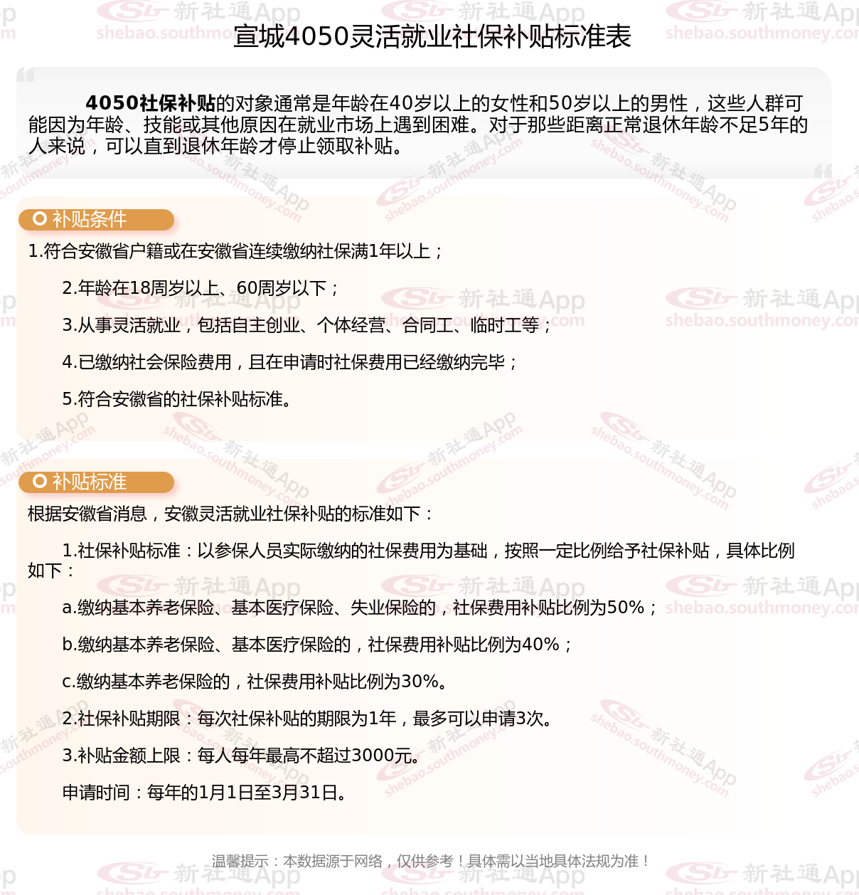 宣城4050社保补贴新规2025年最新标准,就业困难人员灵活就业社保补贴标准是多少钱一个月?2025宣城灵活就业4050社保补贴是一项面向特定年龄段的就业困难人群的社会保险补贴。
