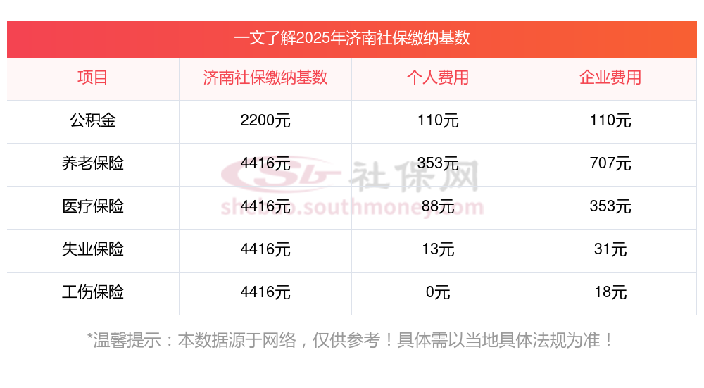 社保的缴费金额取决于多个因素,包括缴费基数、缴费比例以及所在地的具体法规等。接下来看看,2024-2025年济南社会保险缴纳基数及比例一览表 济南个人缴纳社保每月要多少钱,??如下: